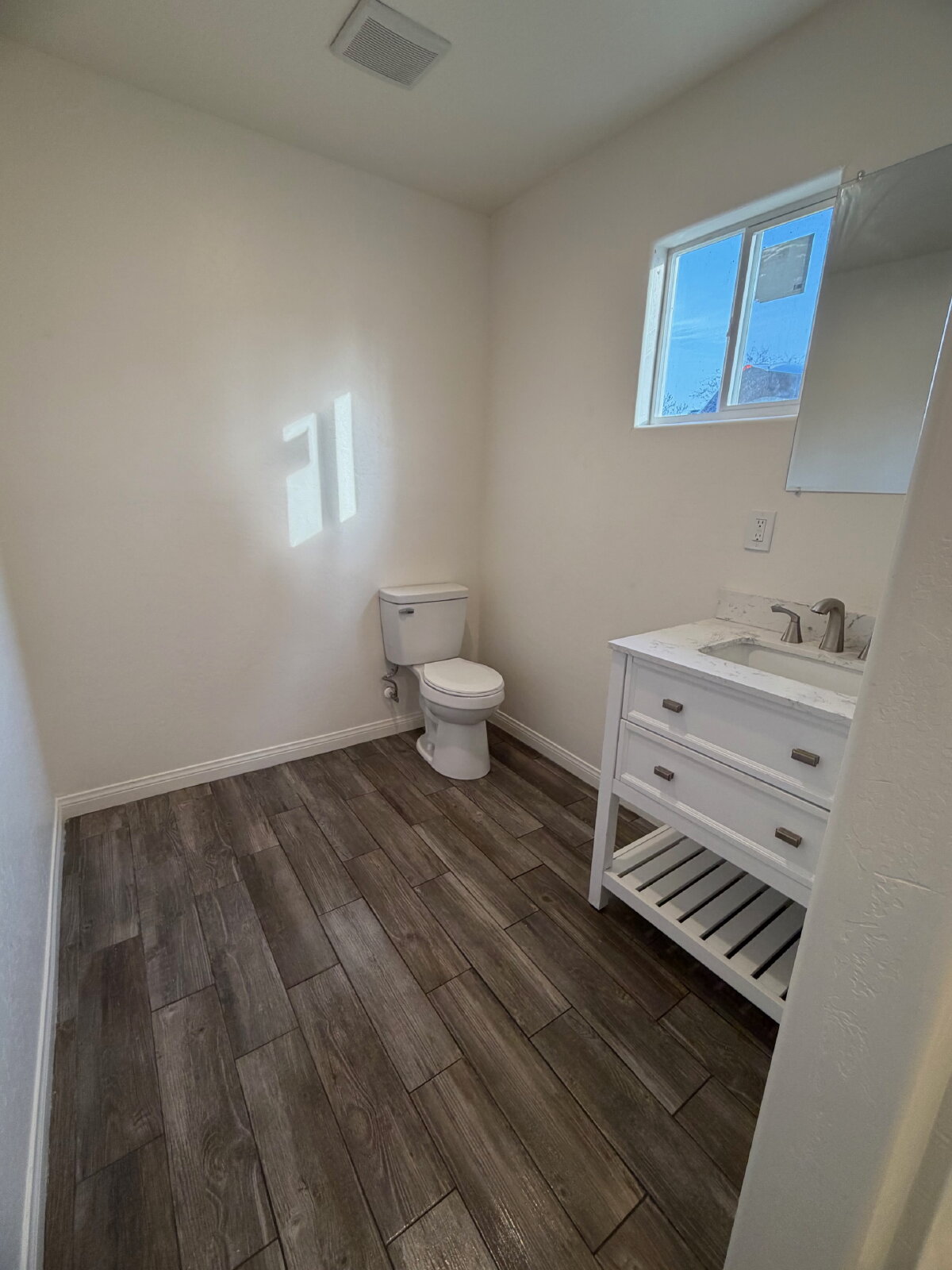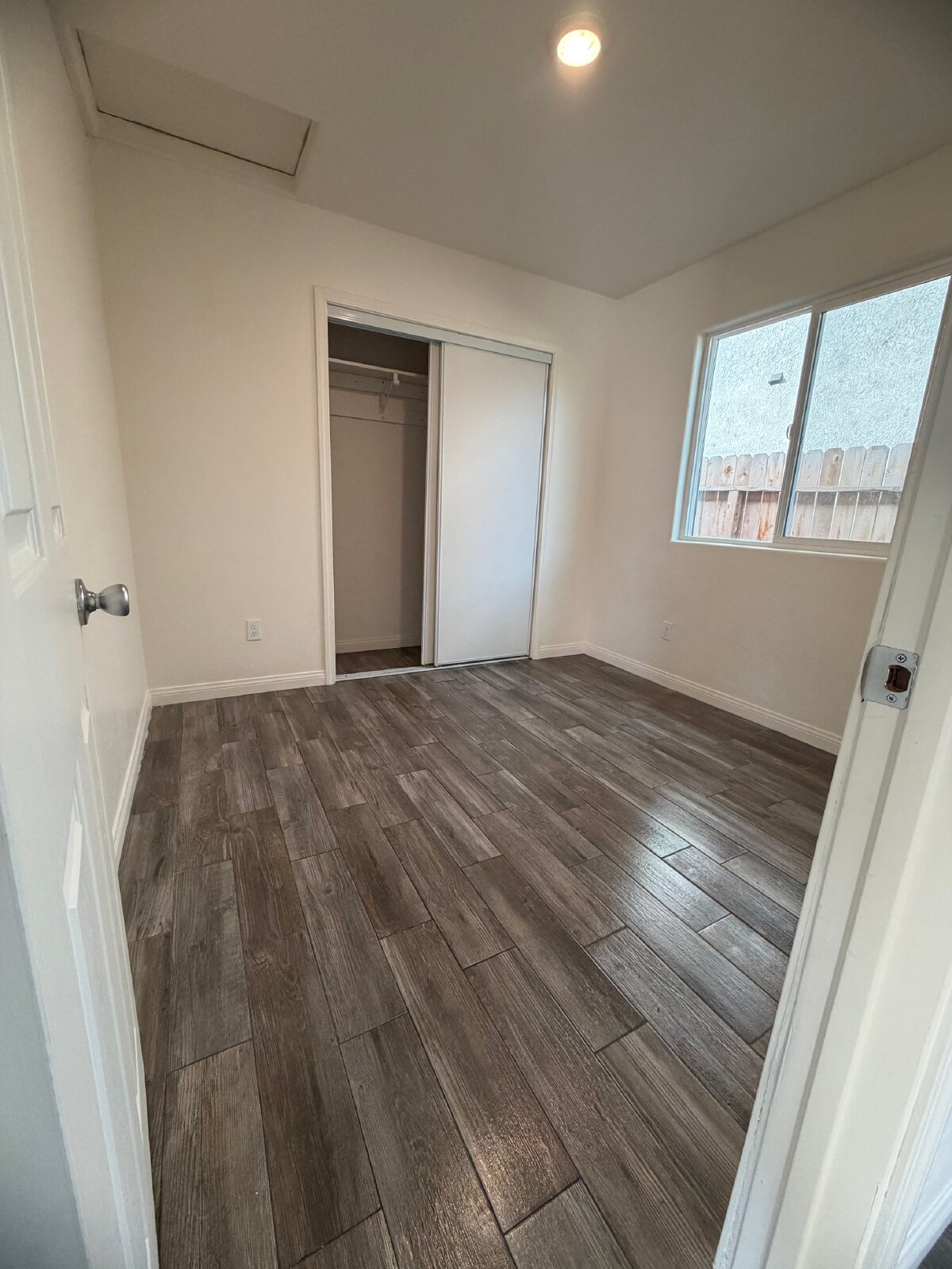 Bedrooms are comfortably sized and include sliding-door closets and natural light. The bathroom has been tastefully updated with a clean vanity, modern fixtures, and a walk-in shower with built-in shelving for added convenience.