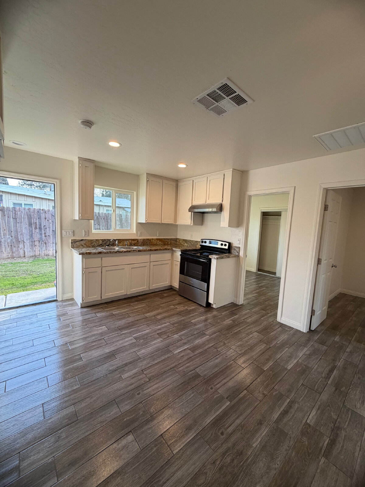 The open living area flows seamlessly into the kitchen, making it ideal for everyday living and entertaining. The kitchen is equipped with crisp white cabinetry, granite-style countertops, modern appliances, and ample storage, with convenient access to the backyard.